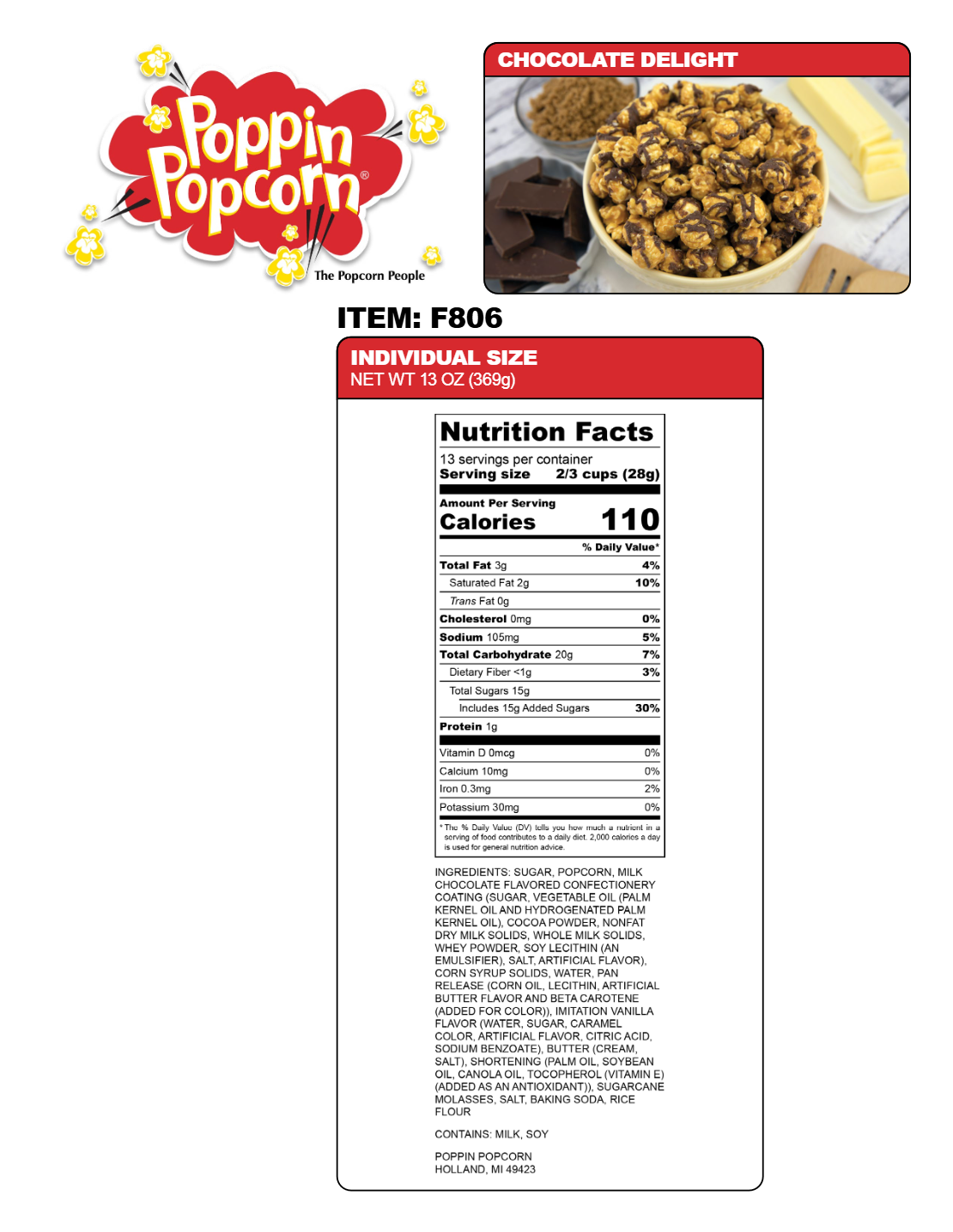 Chocolate Delight: (Individual Size (1/2 Gallon), Resealable Bag, 13 Oz.)-Rich & Buttery Caramel Corn drizzled with Milk Chocolatey Goodness. A Chocolate Lover's Dream!