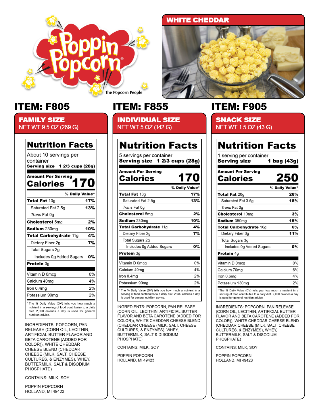 White Cheddar: (Family Sized (Gallon), Resealable, 9.5 Oz.)-Our special blend of creamy white cheddar coats every inch of our fluffy white popcorn, so no bite lacks in cheesiness. Leaving your mouth in a state of complete and utter elation. Gluten free.